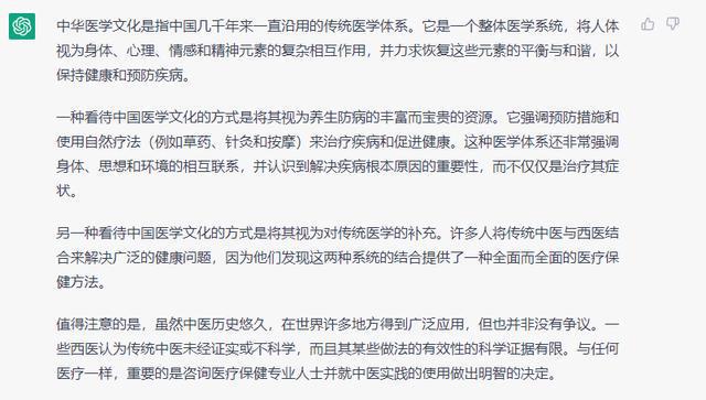 可能是由于翻譯的問(wèn)題,直接理解成了“如何看待中醫(yī)文化”,不過(guò)給出答案還是有點(diǎn)子智慧的,指出了中醫(yī)文化的目標(biāo)是“保持健康和預(yù)防疾病”。