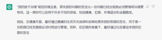 對(duì)于這個(gè)問(wèn)題,它明確指出了“預(yù)防疾病比治療疾病更有效”,另外還舉一反三了,不得不說(shuō),這個(gè)ChatGPT挺高級(jí)的。