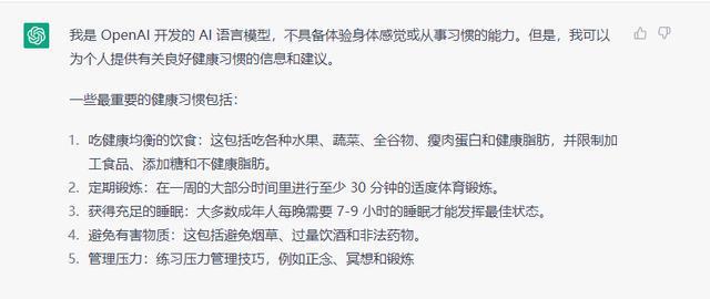 ChatGPT給出了5條建議,分別是健康飲食、合理運(yùn)動(dòng)、充足睡眠、良好習(xí)慣、管理壓力來(lái)回答的,回答的中規(guī)中矩。