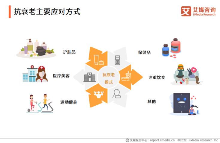 iiMedia Research(艾媒咨詢)數據顯示,68.2%的消費者通過健身進行抗衰老,62.4%的消費者使用護膚品進行抗衰老,注重飲食和服用保健品進行抗衰老的消費者也有將近五成。艾媒咨詢分析師認為,隨著抗衰老護膚品和保健品成分的迭代升級,將會有更多消費者認可抗衰成分的有效性,并通過使用護膚品和服用保健品進行抗衰老。