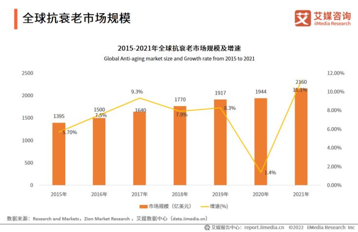 iiMedia Research(艾媒咨詢)數據顯示,全球抗衰老市場規模從2015年的1395億美元增長至2021年的2160億美元,增長了765億美元。2021年全球抗衰老市場規模同比增長率高達11.1%,預計未來全球抗衰老市場規模將保持較高增速,抗衰老市場具有巨大的發展潛力。