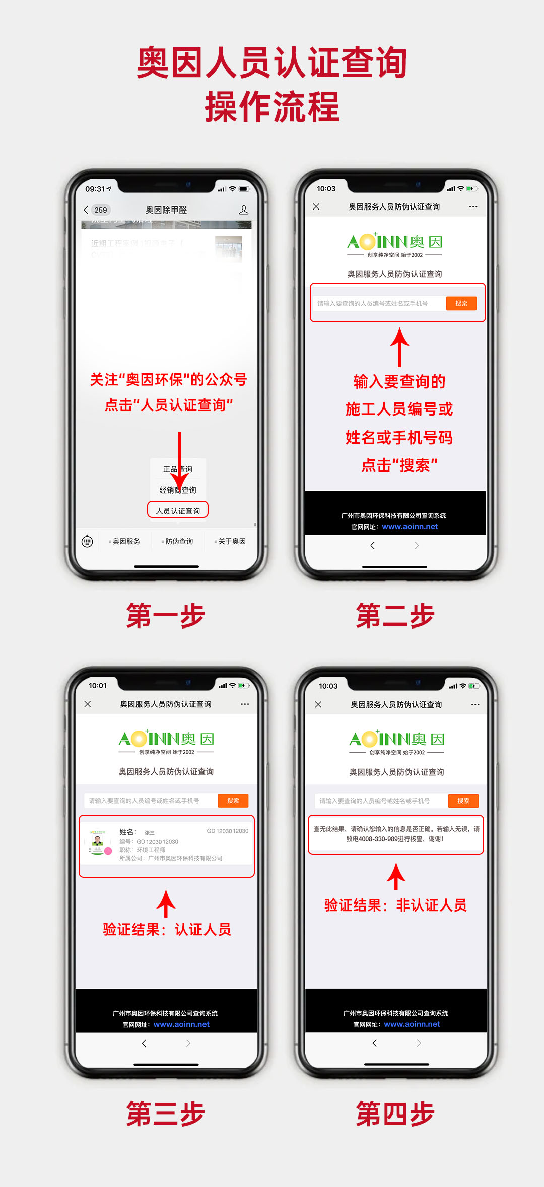 打開(kāi)“奧因環(huán)?!蔽⑿殴娞?hào)的“人員認(rèn)證查詢”,輸入施工人員的姓名、手機(jī)號(hào)碼或施工證件編號(hào),均可驗(yàn)證施工人員是否為奧因認(rèn)證。